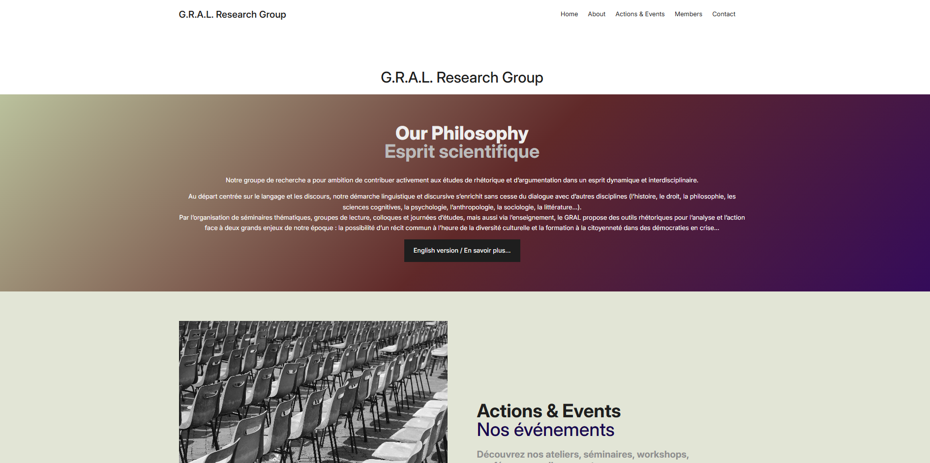 - Un site flambant neuf pour le groupe de recherche GRAL24 novembre 2025Le nouveau site web de notre groupe de recherche en Rhétorique et Argumentation linguistique (GRAL) est en ligne. Il s'agit d'une ressource indispensable pour toutes celles et ceux qui s’intéressent à ces/ses domaines de recherche.
